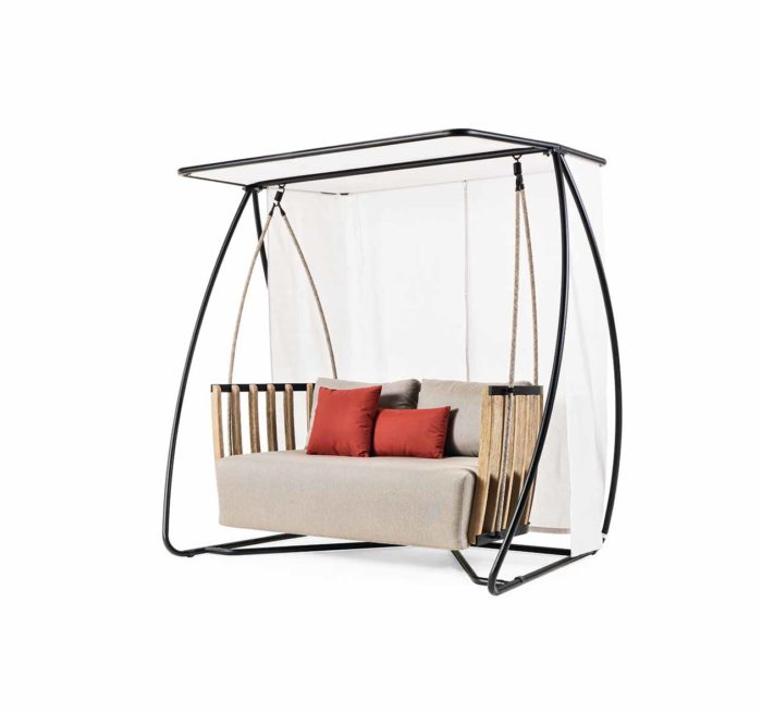 Le swing est comme un nid qui embrasse le corps et l’esprit. Un système raffiné basé sur un jeu de répétition d’une série d’éléments en teck, fixés sur une structure en aluminium, pour des moments infinis de vie en plein air.